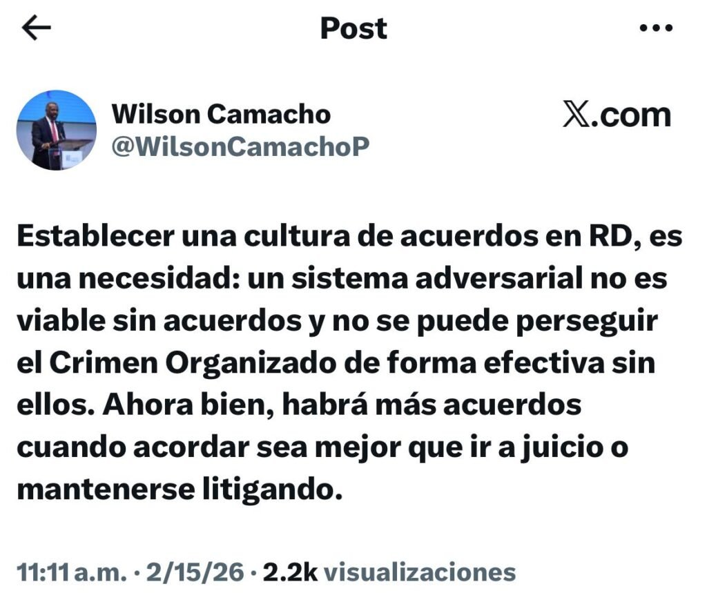 Santo Domingo, RD.-El titular de la Dirección de Persecución del Ministerio Público, Wilson Camacho, afirmó este domingo que la institución continuará promoviendo acuerdos con imputados cuando estos resulten más favorables que ir a juicio, al considerar que estas conciliaciones son esenciales para el funcionamiento del sistema judicial.