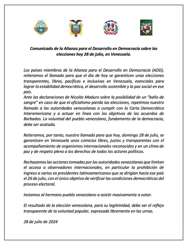 La misiva indica que los países miembros de la Alianza para el Desarrollo en Democracia (ADD), reiteramos el llamado para que el día de hoy se garanticen unas elecciones transparentes, libres, pacíficas e inclusivas en Venezuela, esenciales para lograr la estabilidad democrática, el desarrollo sostenible y la paz social en ese país.