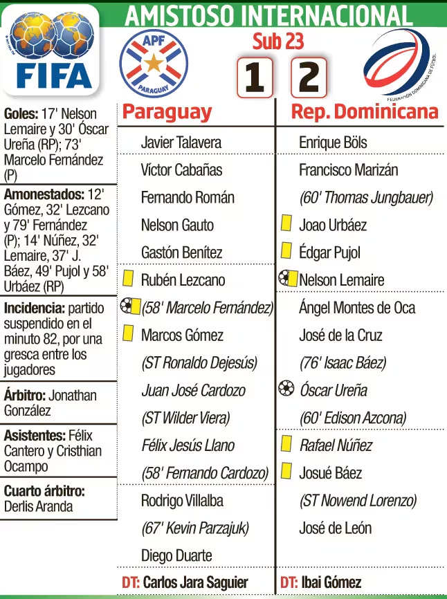 Paraguay.- La segunda contienda entre República Dominicana y Paraguay (sub 23), bajo el auspicio de la FIFA, quedó marcada por una trifulca que obligó a suspender el encuentro en el Estadio La Huerta de Asunción. Lo que comenzó como un partido "amistoso" de fútbol, terminó en un enfrentamiento entre jugadores y fanáticos enardecidos.