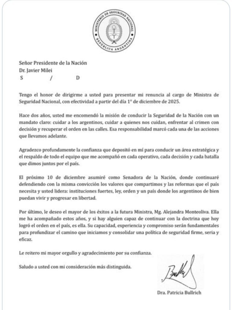 Patricia Bullrich presentó este domingo su renuncia como ministra de Seguridad de Argentina. El anuncio lo realizó a través de sus redes sociales, donde difundió una carta dirigida al presidente Javier Milei. En el mensaje agradeció la “confianza” y el “respaldo” recibido durante su gestión y destacó el trabajo realizado en materia de seguridad.