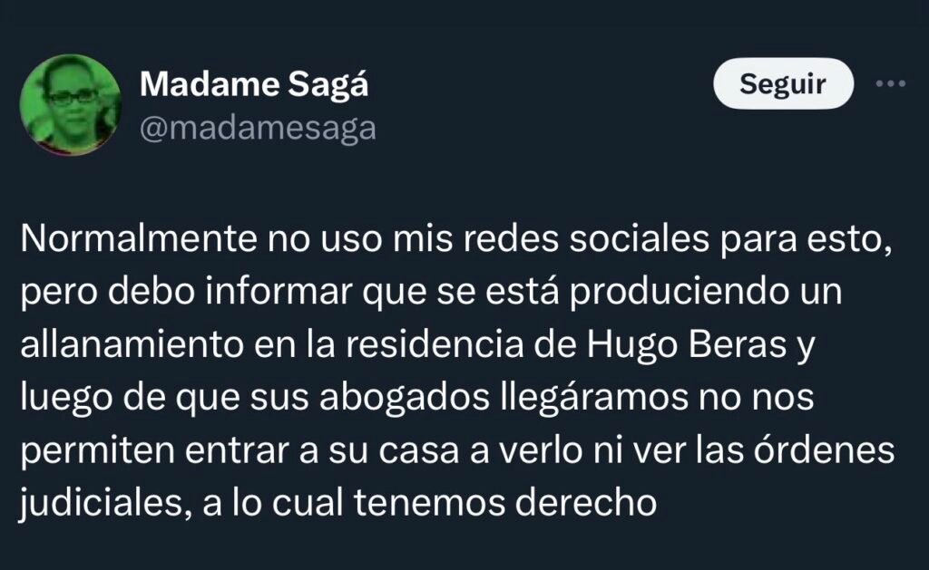 "Normalmente no uso mis redes sociales para esto, pero debo informar que se está produciendo un allanamiento en la residencia de Hugo Beras y luego de que sus abogados llegáramos no nos permiten entrar a su casa a verlo ni ver las órdenes judiciales, a lo cual tenemos derecho", escribió la jurista en la referida red social.