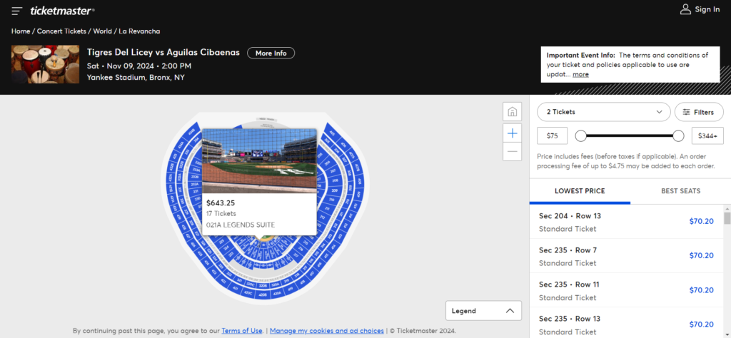 Estados Unidos.- Desde 70 dólares hasta 643 dólares, hasta la fecha este es el rango de precio de las boletas para ver la "Serie de Titanes", que vería enfrentar a los Tigres del Licey y a las Águilas Cibaeñas en Nueva York, este otoño, salieron a la venta con "precios Grandes Ligas", en la plataforma Ticketmaster.