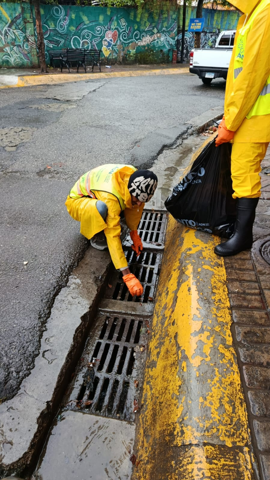En un audiovisual de la Alcaldía del Distrito Nacional, uno de los brigadistas afirma “nosotros estamos desde las 5:00 de la mañana aquí, llevando lo que es este bacheo de drenaje pluvial y contenes”.