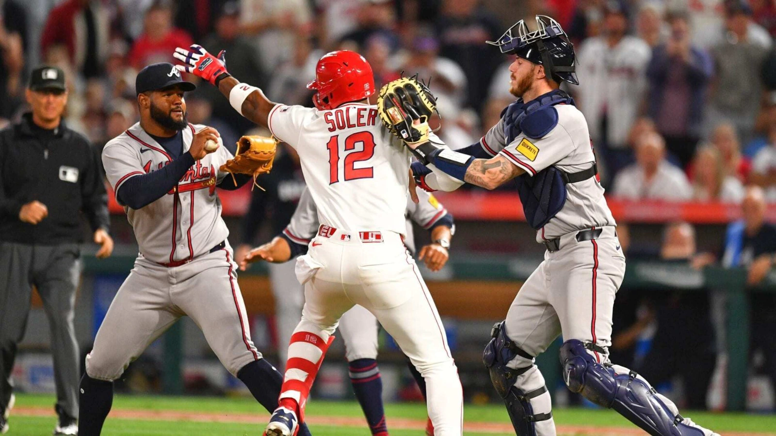 ¡Se armó! Jorge Soler de los Angelinos pelea con Reynaldo López de Atlanta tras un pelotazo