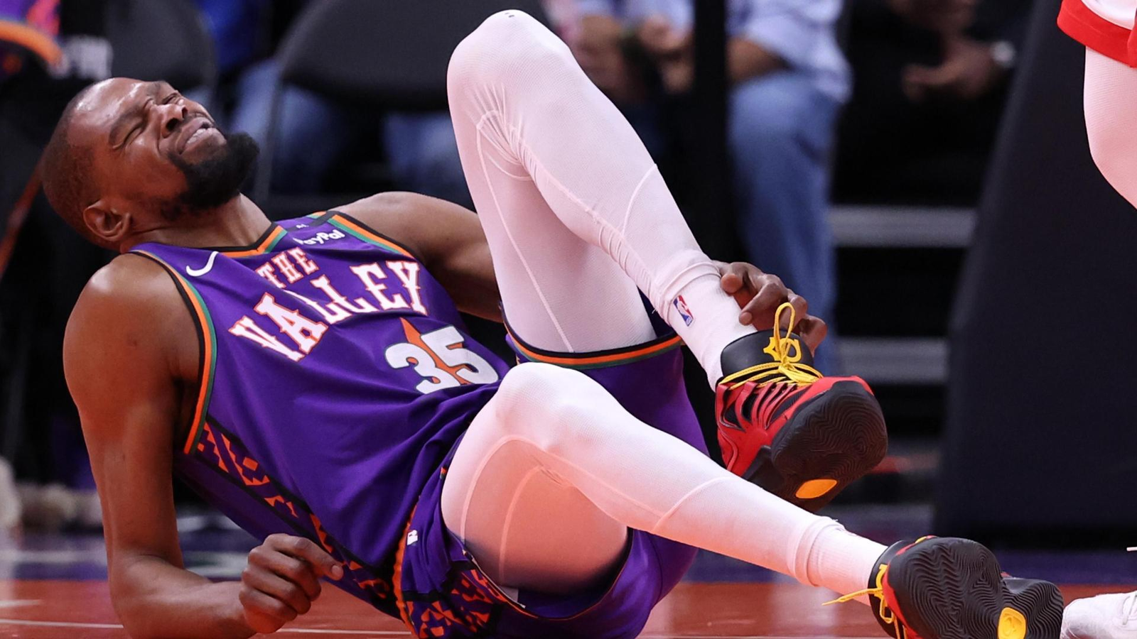 Estados Unidos.- Kevin Durant sufrió una lesión en la pierna izquierda durante la derrota de los Suns de Phoenix ante los Rockets de Houston (148-109) el domingo por la noche. El alero cayó al suelo con 6:57 restantes en el tercer cuarto tras pisar el.