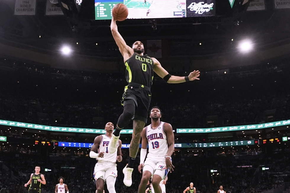 Tatum anota 35 puntos y guía a diezmados Celtics hacia victoria sobre 76ers (123-105)