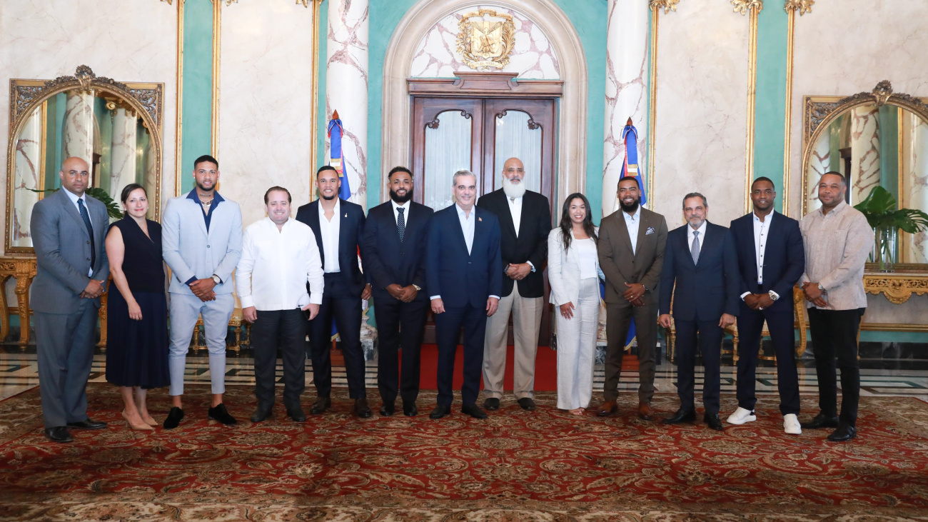 Santo Domingo.- El presidente Luis Abinader recibió en el Palacio Nacional a miembros y directivos de la Asociación de Peloteros de Grandes Ligas (MLBPA), con quienes sostuvo un encuentro en el salón de reuniones. En el mismo, participaron Teoscar Hernández, Junior Caminero, Víctor Robles y Luis Gil, actuales jugadores de Los Angeles.