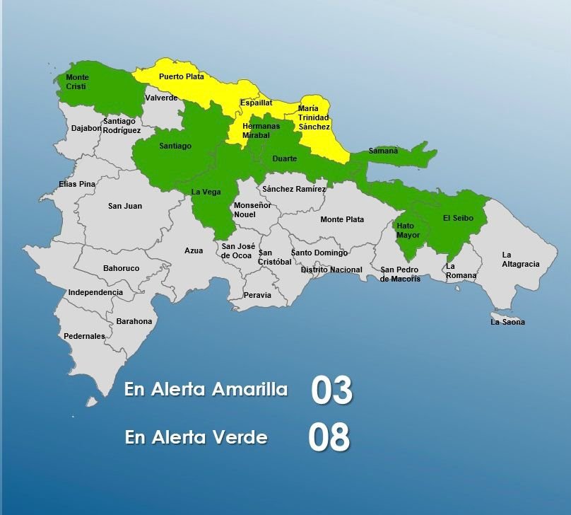 Santo Domingo. – El Centro de Operaciones de Emergencias (COE) aumento a tres las provincias colocadas en amarilla y a ocho el verde, debido a la permanencia de las lluvias por un sistema frontal ubicado al noreste del territorio nacional y a una onda tropical.
