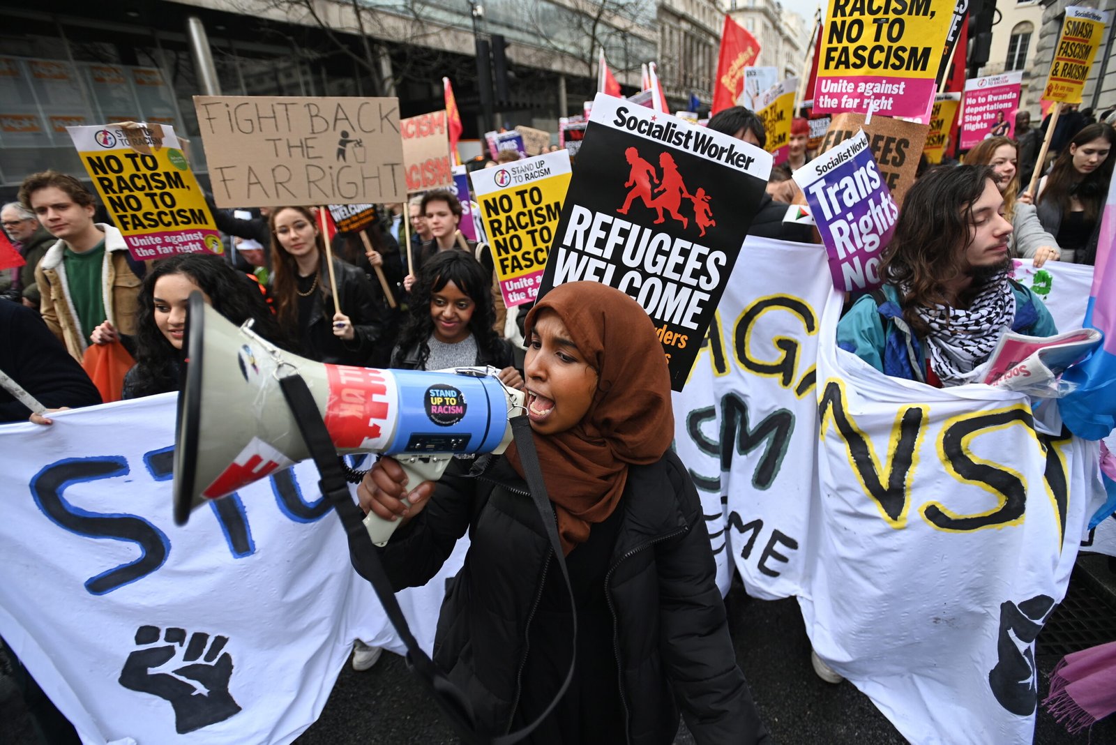 Más de 100,000 personas se sumaron este sábado en Londres a una manifestación convocada por el activista de extrema derecha Tomy Robinson para protestar contra el aumento de la inmigración ilegal, que fue contestada por otra protesta contra el racismo y a favor de los solicitantes de asilo en el Reino Unido. Unas 110.000 personas, según.