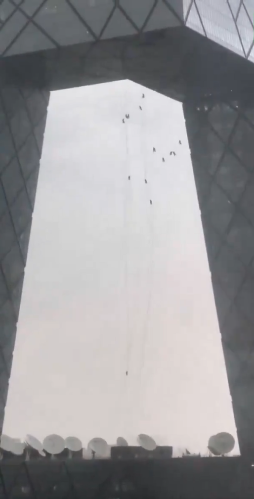 Trabajadores de limpieza de Pekin quedaron colgados en rascacielos por fuerte viento