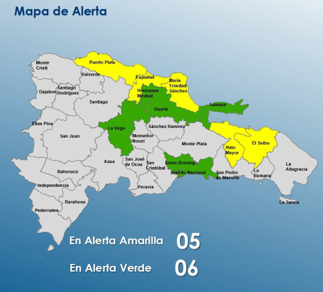 Santo Domingo.- El Centro de Operaciones de Emergencias (COE), mantiene a 13 las provincias en alerta debido a un sistema frontal que puede causar posibles crecidas de ríos, arroyos y cañadas, así como inundaciones repentinas o urbanas. En alerta amarilla están: Puerto Plata, María Trinidad.