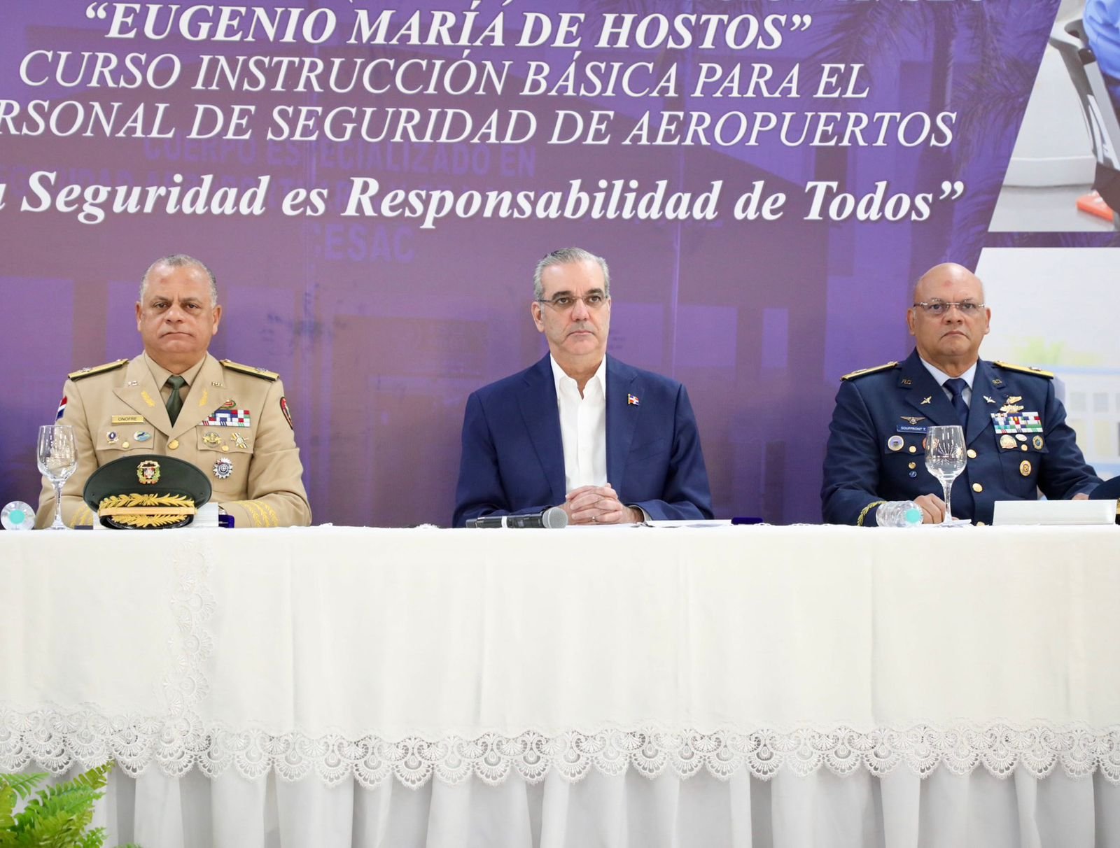 Santo Domingo.- El presidente Luis Abinader acompañado del ministro de Defensa teniente general Carlos Fernández Onofre, encabezó este jueves el acto de graduación múltiple del Cuerpo Especializado en Seguridad Aeroportuaria y de la Aviación Civil (CESAC), correspondiente a la Trigésima Sexta Promoción del Curso de.