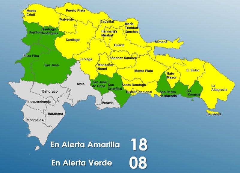 República Dominicana. – La dirección del Centro de Operaciones de Emergencia (COE), informó que se mantienen (18) Provincias en Alerta Amarilla y (8) provincias en Alerta Verde por posibles inundaciones repentinas urbanas y rurales, crecidas de ríos, arroyos y cañadas, así como deslizamientos de tierra..