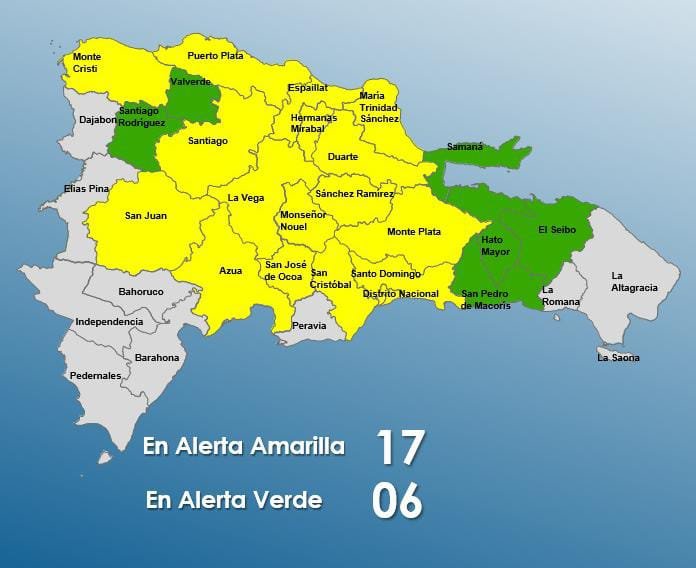 Santo Domingo.- El Centro de Operaciones de Emergencias COE modificó los niveles de alertas verde y amarilla en varias provincias del país debido a posibles crecidas de ríos arroyos y cañadas así como inundaciones repentinas o urbanas. El COE descontinuó alerta amarilla en varias provincias..