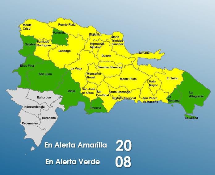El Centro de Operaciones de Emergencias (COE) incrementó el nivel de alerta amarilla en 19 provincias y el Distrito Nacional y mantiene ocho en alerta verde por posibles crecidas de ríos arroyos y cañadas así como inundaciones repentinas o urbanas. El COE indicó que de.