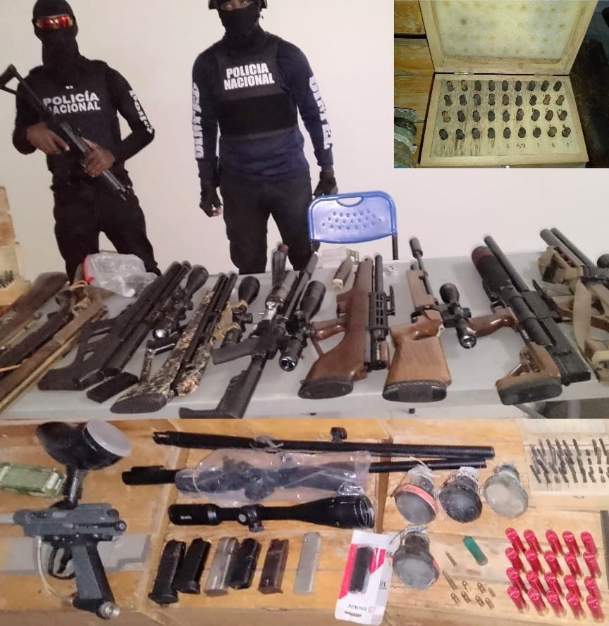 Miembros policiales del Departamento de Inteligencia Delictiva (DINTEL) y de Prevención, en colaboración con el Ministerio Público, lograron la captura de un hombre en posesión de 11 armas de fuego, así como también equipos militares, durante un allanamiento realizado en el municipio de Neyba, provincia.
