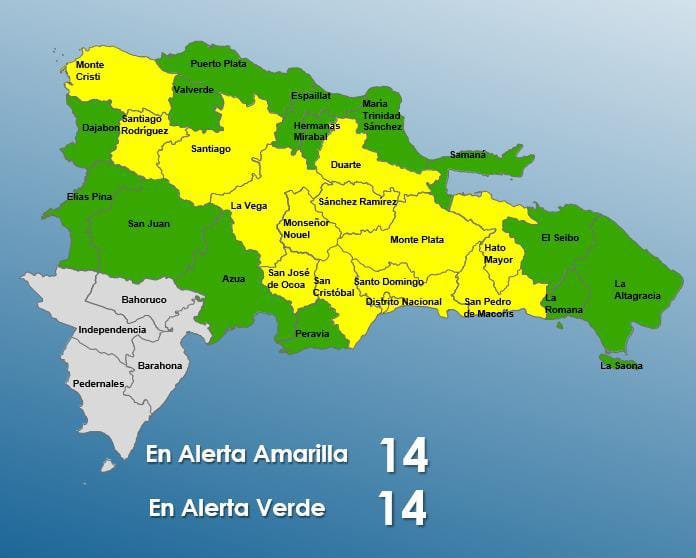 Santo Domingo.- El Centro de Operaciones de Emergencias (COE) colocó 27 provincias y el Distrito Nacional en alertas verde y amarilla por posibles crecidas de ríos arroyos y cañadas así como inundaciones repentinas o urbanas. El COE indicó que continuarán los aguaceros de moderados a.