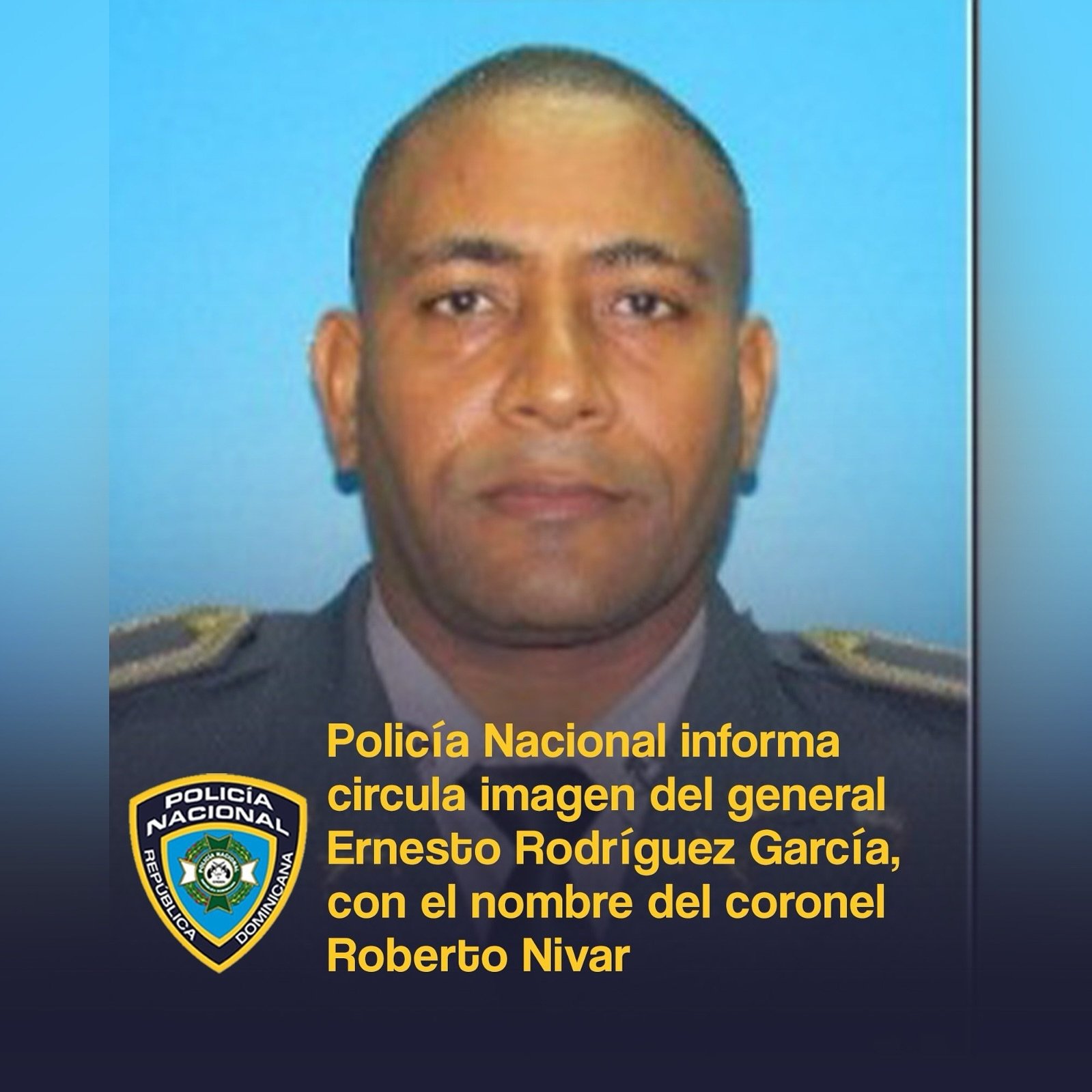 Santo Domingo, RD. -La Policía Nacional informó la tarde de este martes que desde ayer se está circulando la imagen incorrecta  del general Ernesto Rodríguez García, actual director Central de Prevención, en lugar de la correspondiente al coronel Roberto Nivar, quien recientemente fue designado encargado.