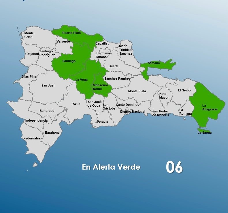 Santos Domingo. – Santiago, Monseñor Nouel, La Altagracia, La Vega, Puerto Plata y Samaná fueron las provincias colocadas en alerta verde por el Centro de Operaciones de Emergencias (COE), debido a las condiciones atmosféricas inestables que generarán aguaceros, tormentas eléctricas y ráfagas de viento durante.