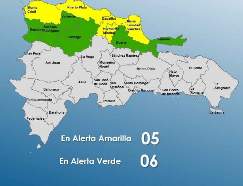 Santo Domingo.- El Centro de Operaciones de Emergencias (COE) aumentó a cinco las provincias en alerta amarilla y seis en verde, debido a que desde tempranas horas, nublados asociados al sistema frontal, que permanece próximo a la costa norte del país, provocan lluvias de intensidad variable, llegando.