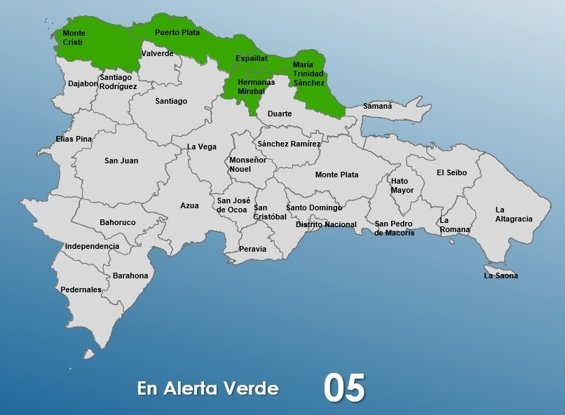 Santo Domingo.- El Centro de Operaciones de Emergencias (COE) emitió alerta verde para cinco provincias, debido a que una vaguada frontal está ubicada al norte del país sus efectos para la tarde se sumarán al viento del noreste y los efectos orográficos para provocar locales.