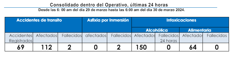 El Centro de Operaciones de Emergencia (COE) ha emitido su segundo boletín del operativo "Conciencia por la Vida 2024″ en el marco de la Semana Santa, reportando un total de cuatro muertes y 69 accidentes de tránsito hasta la fecha.
