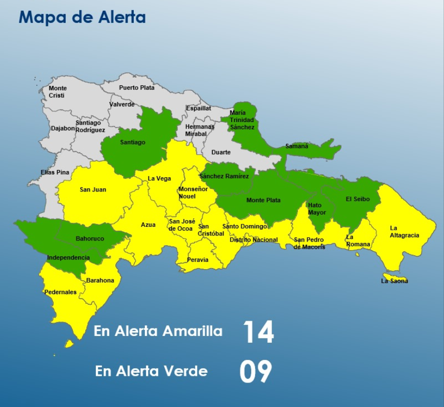 Ante el posible impacto del sistema, el COE modificó los niveles de alerta en cumplimiento de la Ley 147-02 sobre Gestión de Riesgos, debido al riesgo de crecidas de ríos, arroyos y cañadas, así como inundaciones repentinas o urbanas.