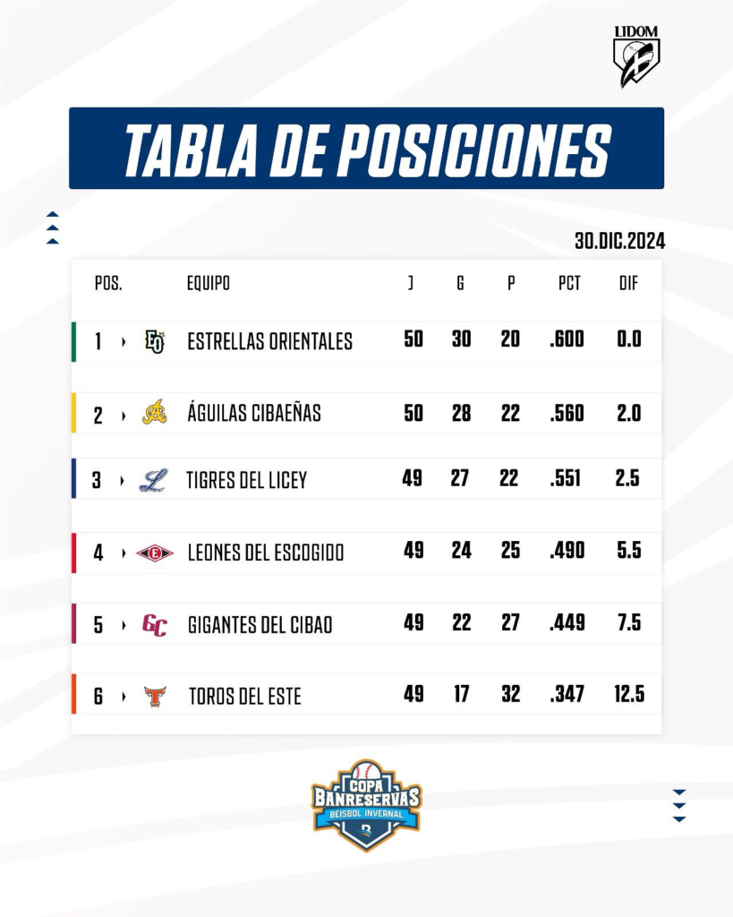 Santo Domingo.- La Liga de Beisbol Profesional de República Dominicana (LIDOM) ha publicado la tabla de posiciones más actualizada, en base a los resultados de los últimos partidos de la pelota invernal.