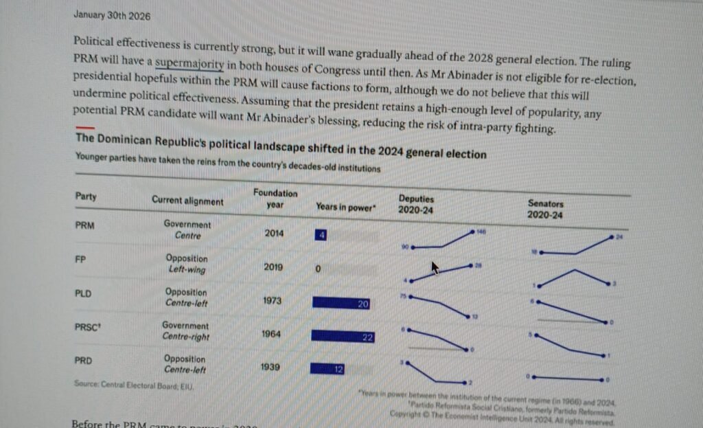 En el plano político, se espera una gobernabilidad sólida bajo el liderazgo del presidente Luis Abinader, cuyo mandato se extiende hasta 2028. El oficialista Partido Revolucionario Moderno (PRM) cuenta con supermayorías en ambas cámaras del Congreso, lo que facilitará la aprobación de políticas de corte promercado. Aunque los riesgos de inestabilidad política son contenidos, persiste una amenaza moderada de contagio de la crisis haitiana.