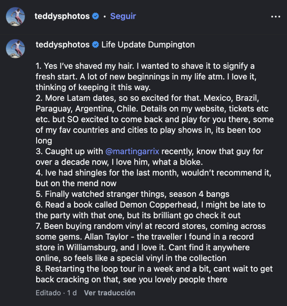 La noticia se dio a conocer a través de una publicación en su cuenta oficial de Instagram, donde Sheeran explicó que este padecimiento ha coincidido con una fase de reestructuración en su entorno. Aunque no profundizó en detalles médicos específicos, el intérprete de "Shape of You" enfatizó que se está tomando el tiempo necesario para priorizar su bienestar físico, integrando este desafío como parte de las transiciones que está viviendo este año.