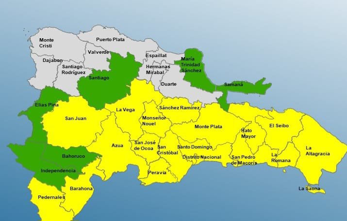 Mientras que en alerta verde siguen: Santiago, Elias Piña, Bahoruco, Independencia, María Trinidad Sánchez y Samaná.
