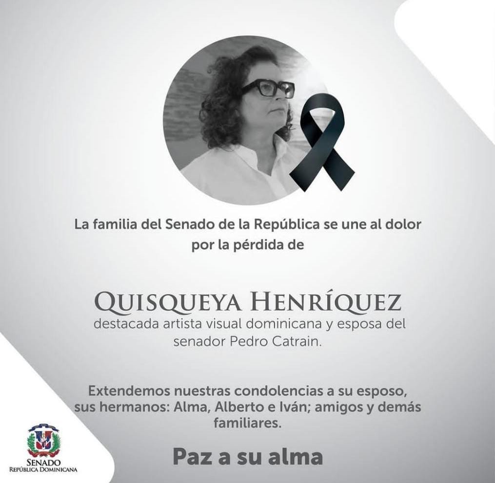 La muerte tocó también la puerta de la artista, Quisqueya Henríquez, esposa del senador de Samaná, Pedro Catrain, quién murió tras perder la lucha contra el cáncer de estómago.