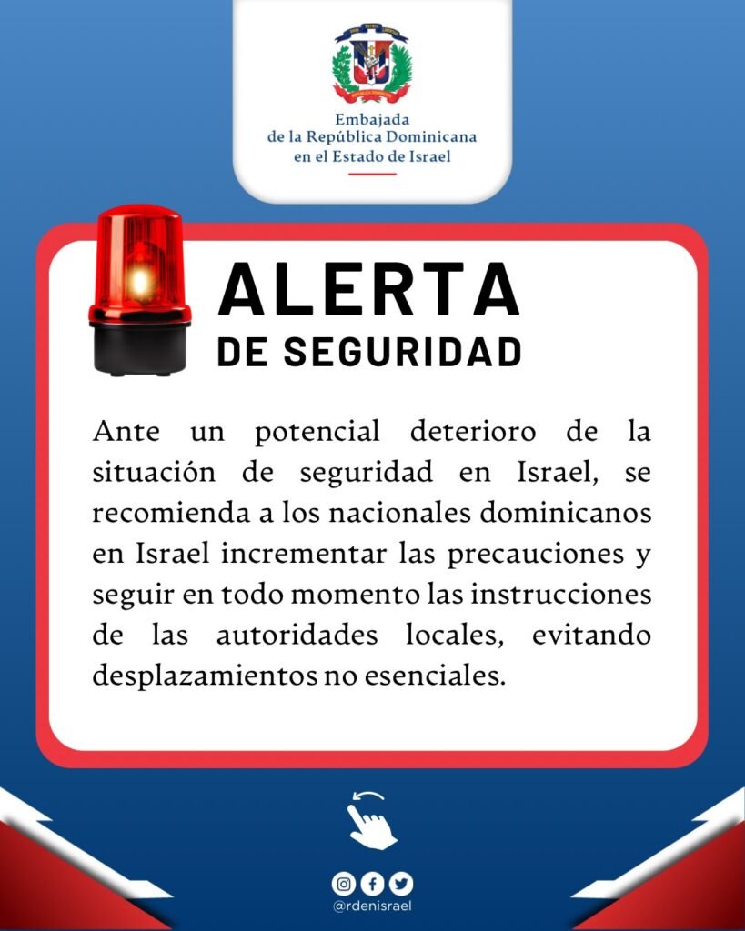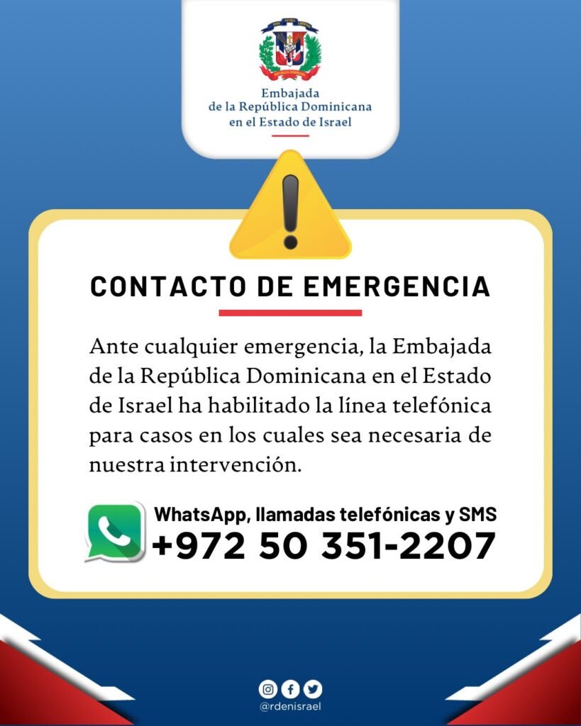 De ser necesario un contacto de emergencia, la sede diplomática dominicana en Israel colocó el número (0)50 351 2207.