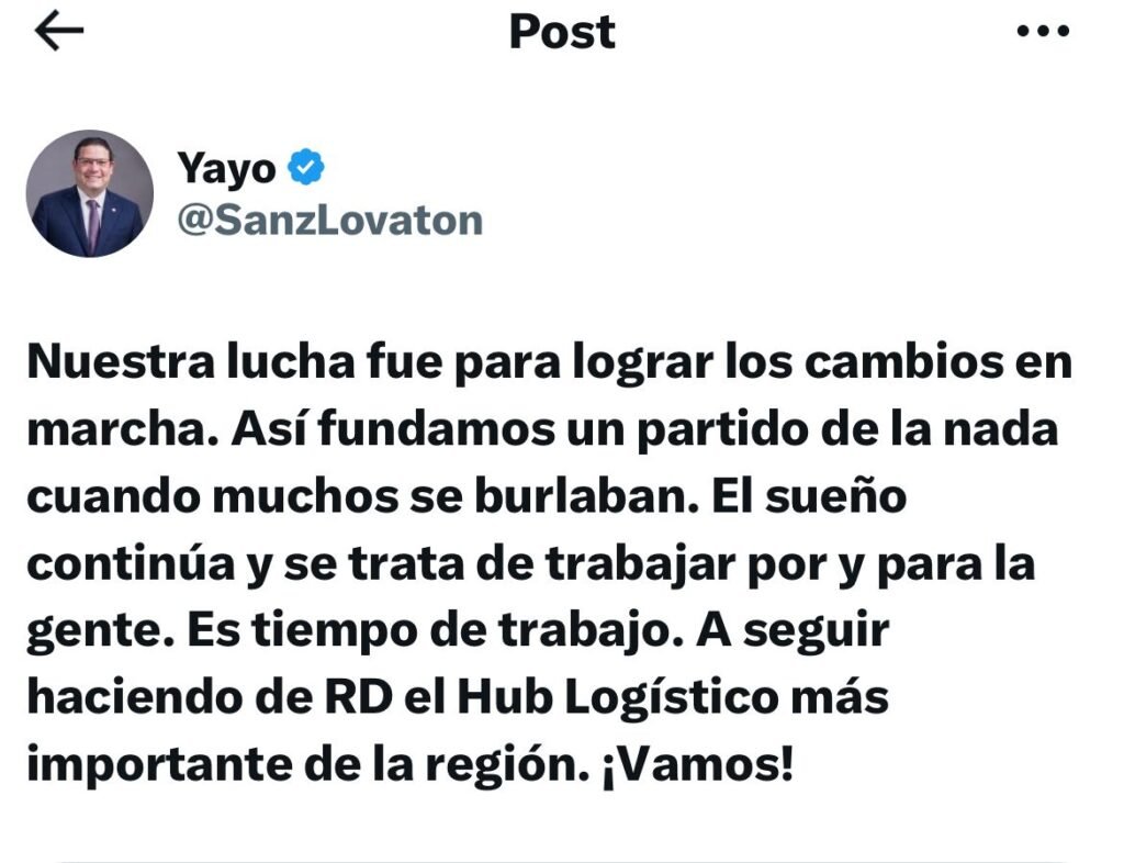 Ese sueño sigue vivo, y se trata de seguir trabajando por y para la gente. Es tiempo de concentrarse en el trabajo. Sigamos construyendo una República Dominicana que sea el Hub Logístico más importante de la región. ¡Vamos!”, escribió en la red social.