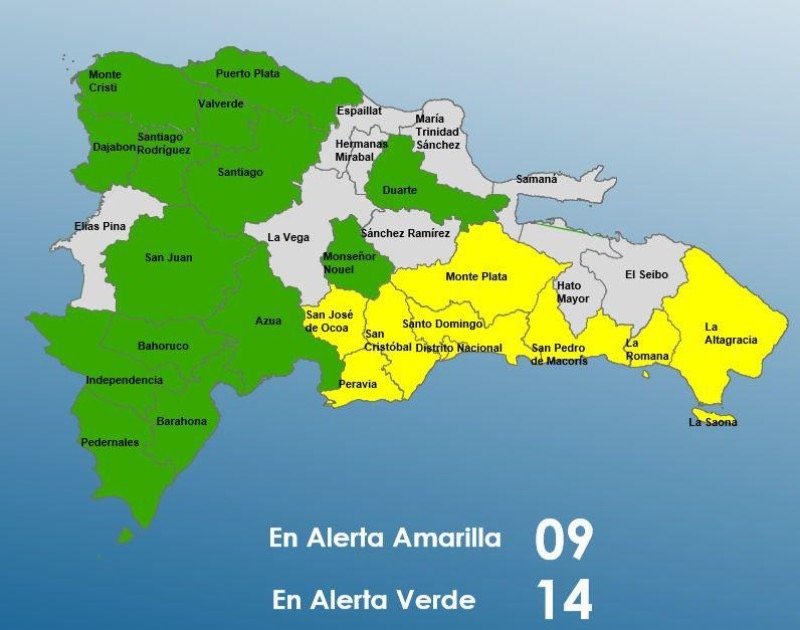 El Centro de Operaciones de Emergencias (COE) informó que mantiene nueve provincias en alerta amarilla y catorce en alerta verde, debido a los efectos de una onda tropical que ha generado intensos aguaceros desde la madrugada de este domingo en distintas zonas del país. Las provincias que permanecen.