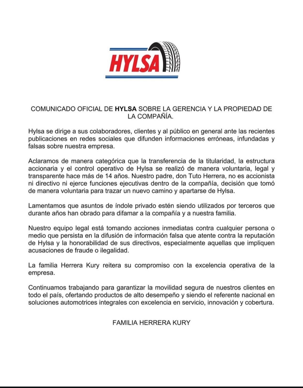 Santo Domingo. — La empresa Hylsa emitió un comunicado oficial en el que desmiente categóricamente las versiones difundidas recientemente en redes sociales sobre supuestos cambios en su estructura accionaria y su dirección. La compañía aclaró que la transferencia de titularidad, estructura accionaria y control operativo.