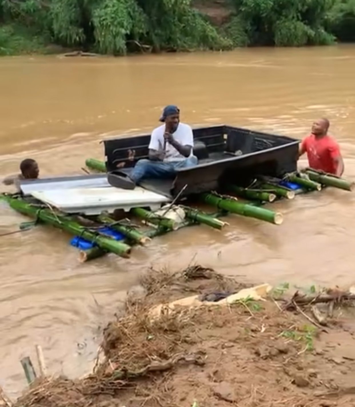 Comunitarios improvisan canoa para cruzar de Don Juan a Yamasá tras colapso de puente