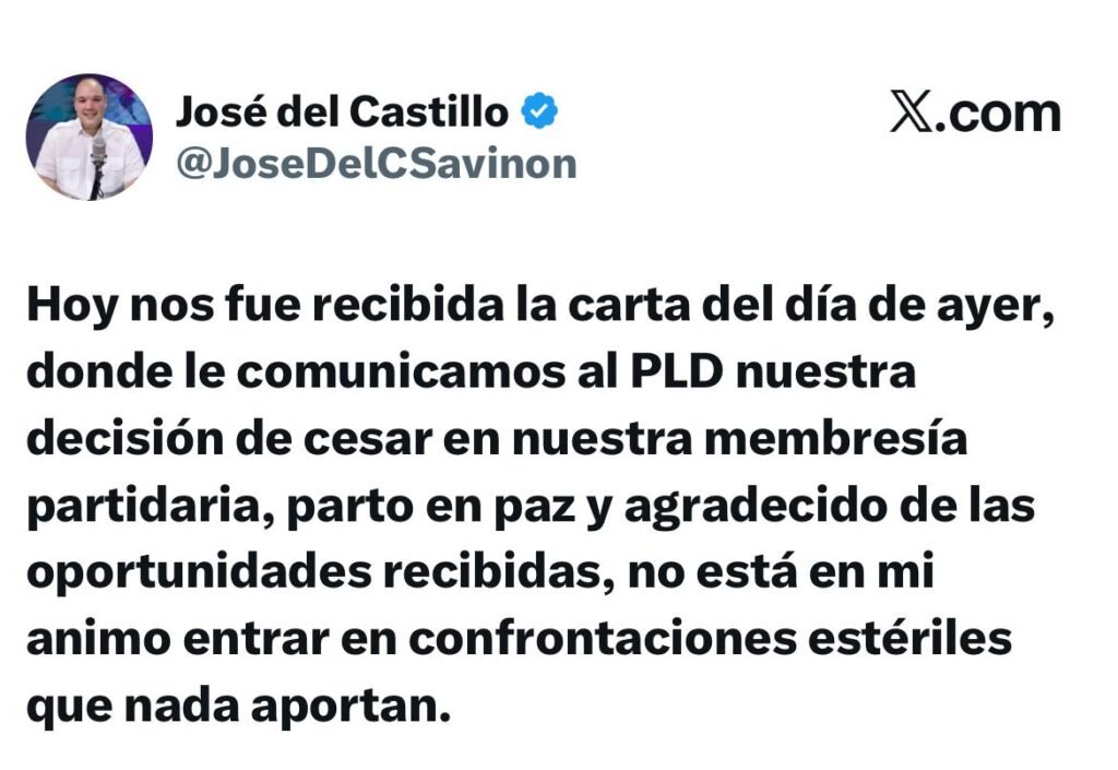 Del Castillo compartió el anuncio en su cuenta de X (antes Twitter), donde expresó: “Hoy nos fue recibida la carta del día de ayer, donde le comunicamos al ⁦PLD nuestra decisión de cesar en nuestra membresía partidaria. Parto en paz y agradecido de las oportunidades recibidas. No está en mí ánimo entrar en confrontaciones estériles que nada aportan”.