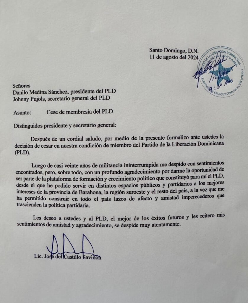 El exsenador por la provincia de Barahona, José del Castillo Saviñón, anunció su renuncia al Partido de la Liberación Dominicana (PLD), organización en la que militó durante casi 20 años.