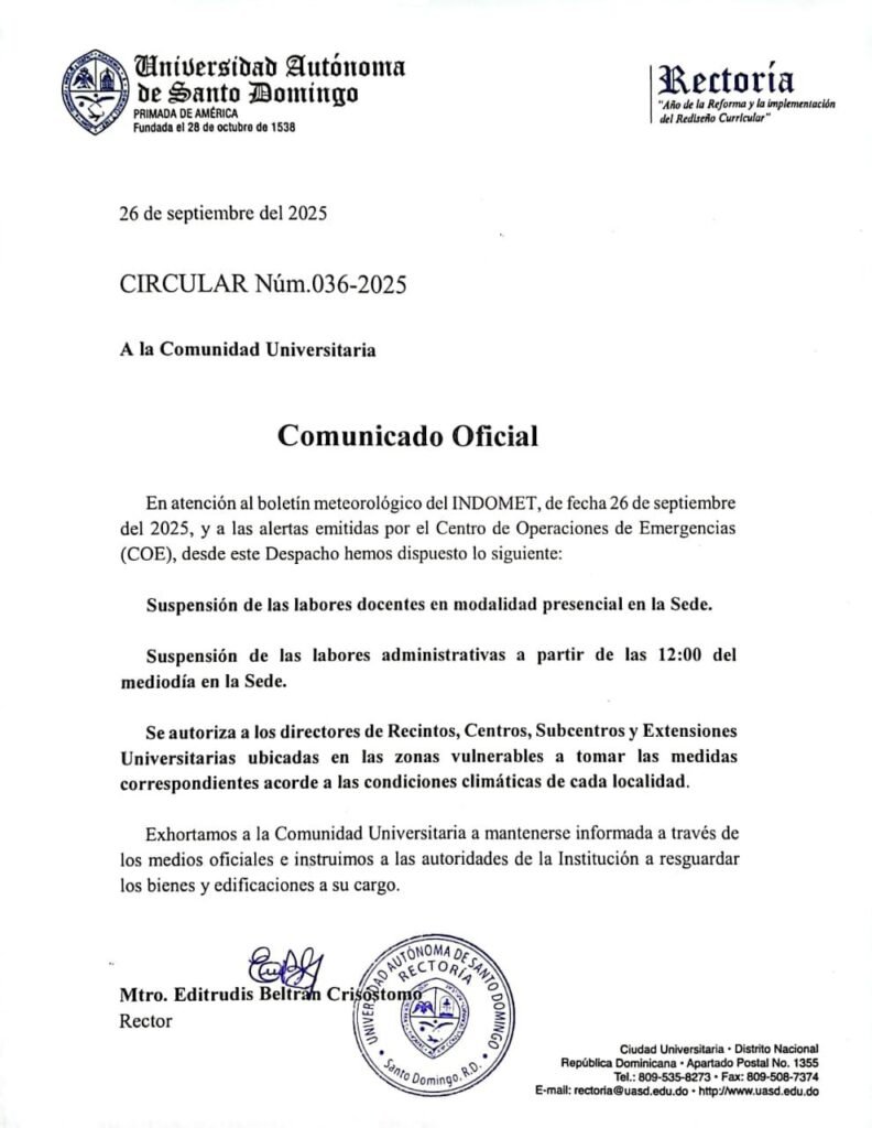 Santo Domingo. – La Universidad Autónoma de Santo Domingo (UASD) anunció la suspension docente y administrativa en su sede principal en atención al boletín emitido por el Instituto Nacional de Meteorología (Indomet) y a las alertas del Centro de Operaciones de Emergencias (COE).