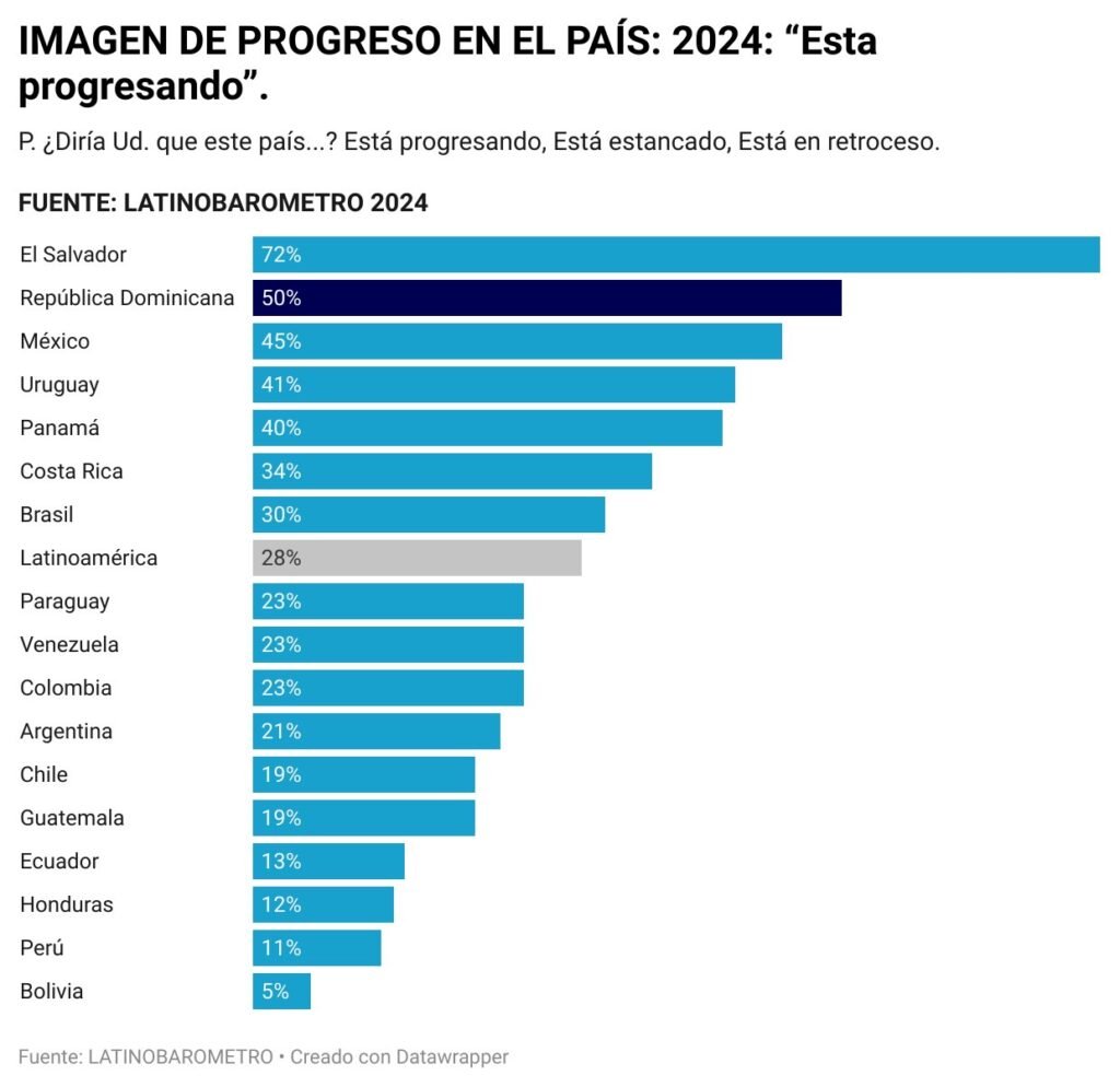 El 50% de los dominicanos percibe que el país está progresando, ubicándose como el segundo mejor evaluado en este indicador, solo detrás de El Salvador (72%) y muy por encima del promedio regional de 28%.
