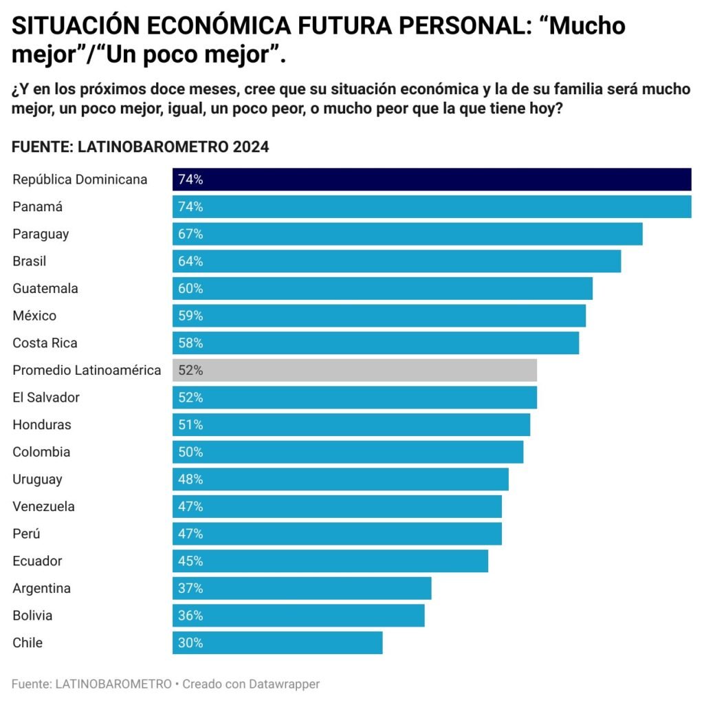El 74% de los dominicanos considera que su situación económica mejorará en los próximos 12 meses, colocándose junto a Panamá como los países con mayor optimismo económico en América Latina. Este porcentaje contrasta significativamente con el promedio regional de 52%.