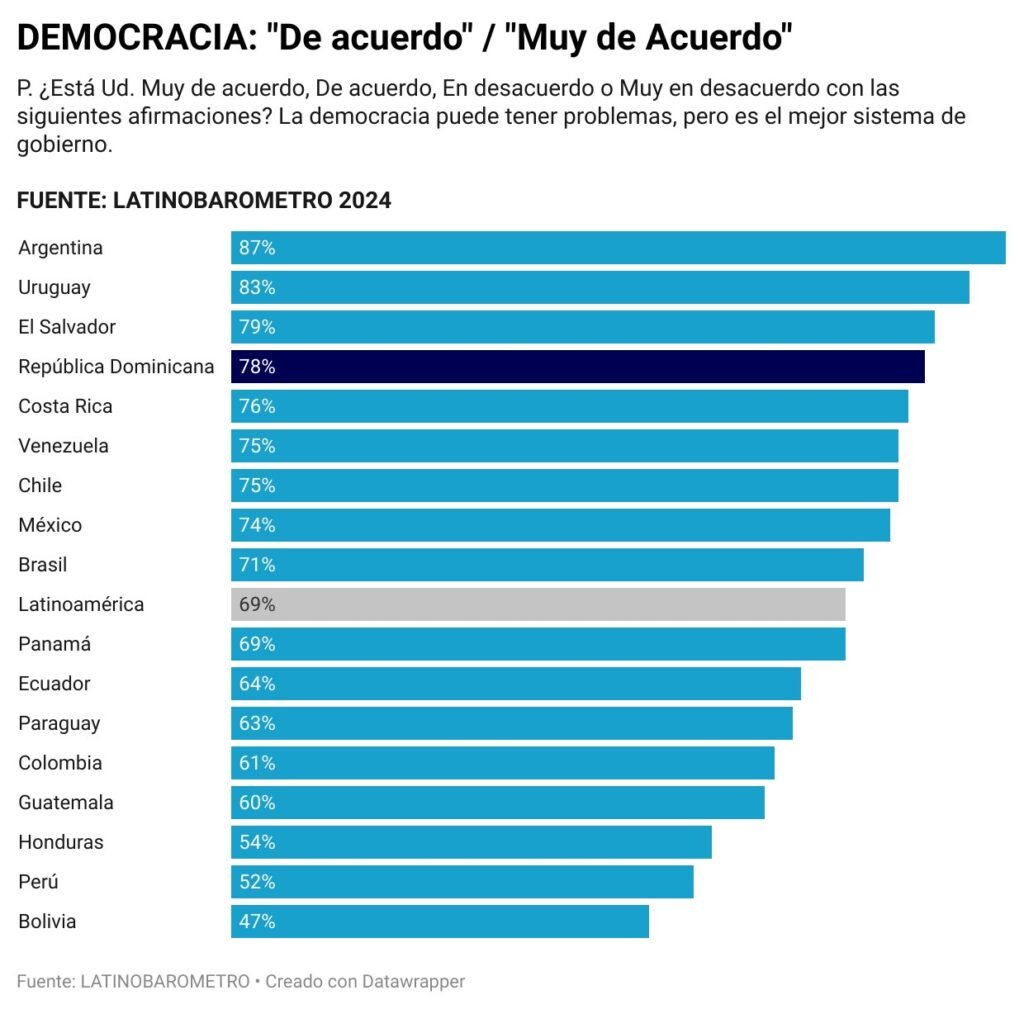El 78% de los dominicanos está de acuerdo en que, a pesar de sus problemas, la democracia es el mejor sistema de gobierno. Este resultado coloca al país entre los líderes de la región, superando el promedio regional de 69% y destacándose frente a países como Panamá (69%) y Ecuador (64%).