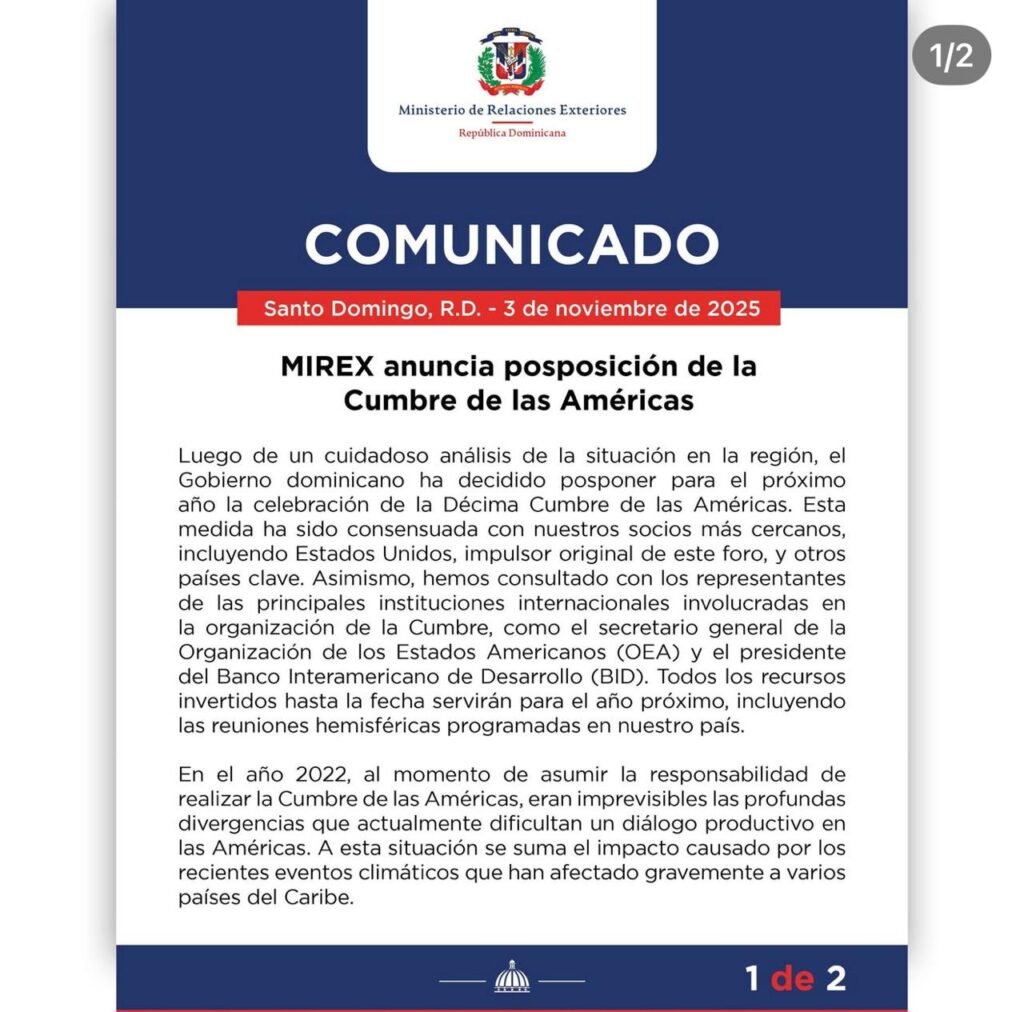 Luego de un cuidadoso análisis de la situación en la región, el Gobierno dominicano ha decidido posponer para el próximo año la celebración de la Décima Cumbre de las Américas. Esta medida ha sido consensuada con nuestros socios más cercanos, incluyendo Estados Unidos, impulsor original de este foro, y otros países clave. Asimismo, hemos consultado con los representantes de las principales instituciones internacionales involucradas en la organización de la Cumbre, como el secretario general de la Organización de los Estados Americanos (OEA) y el presidente del Banco Interamericano de Desarrollo (BID). Todos los recursos invertidos hasta la fecha servirán para el año próximo, incluyendo las reuniones hemisféricas programadas en nuestro país.