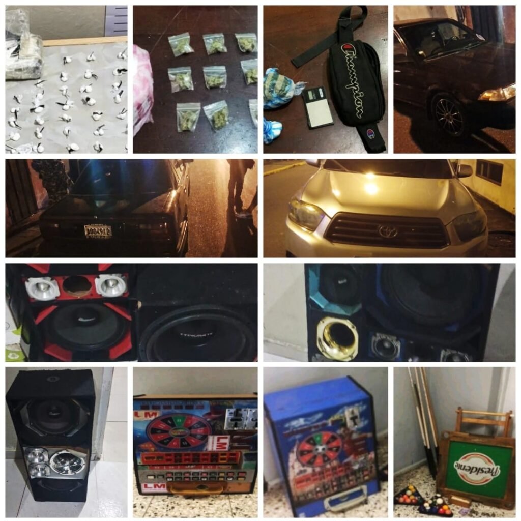 En las intervenciones, las autoridades incautaron 30 porciones de sustancias controladas, siete armas de fuego, dos máquinas tragamonedas, cinco cajones de bocinas por contaminación sónica y 131 motocicletas retenidas para fines de investigación.