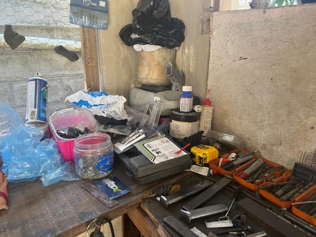 Asimismo, se incautaron 25 armazones de pistolas, 16 cargadores, 10 correderas de pistolas, un armazón de revólver, un cañón de escopeta, además de herramientas y maquinarias como sopletes, taladros, pulidoras y un torno o fresadora.