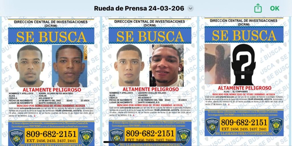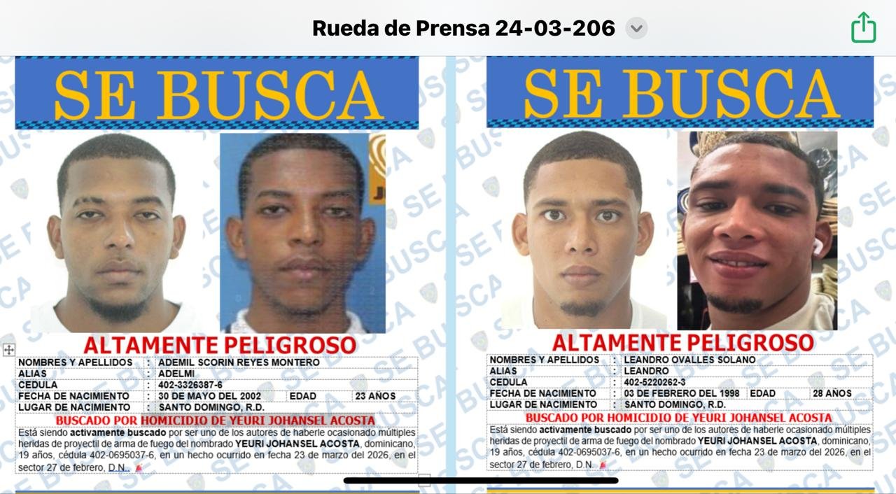 Santo Domingo, RD.-La Policía Nacional informó que mantiene activa la búsqueda de Leandro Ovalles Solano, de 28 años, Ademil Scorin Reyes Montero, de 23 y un tercero identificado hasta el momento como "El Compañero", señalados como responsables del asesinato de Jeuri Johansel Acosta, ocurrido la noche del 23 de marzo en el sector 27 de Febrero del Distrito Nacional.