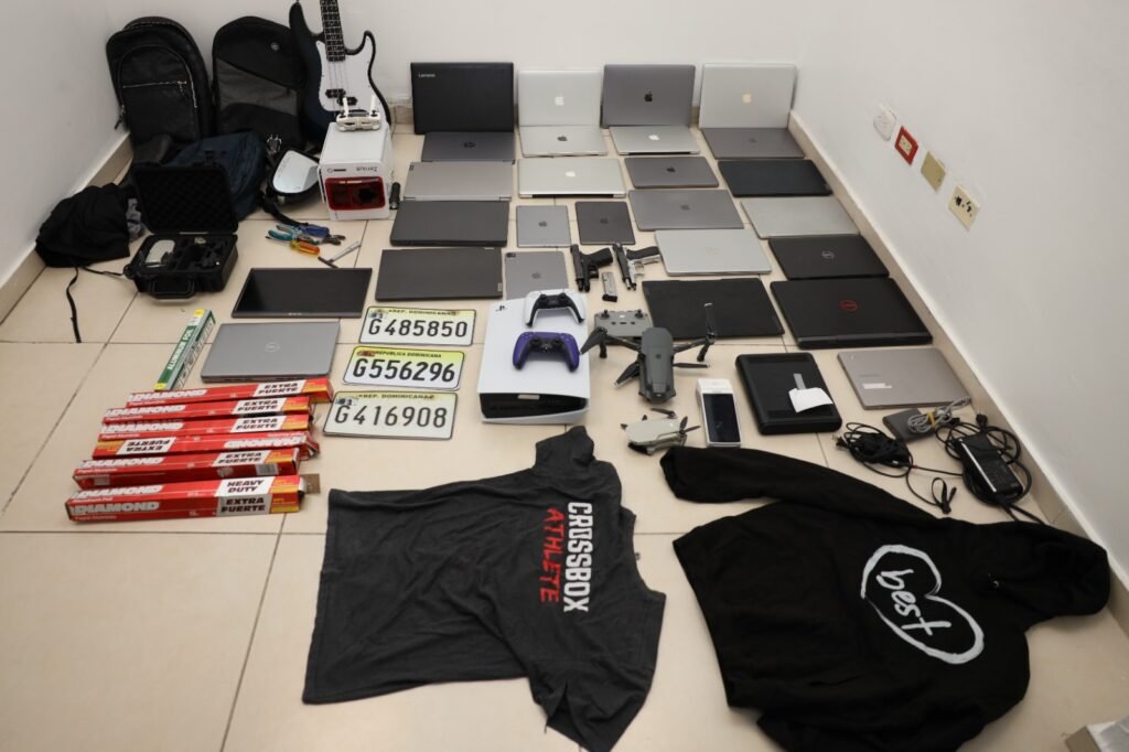 Durante varias intervenciones y labores de inteligencia, las autoridades incautaron unas 50 computadoras, dos armas de fuego, una consola de videojuegos, un dron y tres vehículos de distintas marcas y modelos.