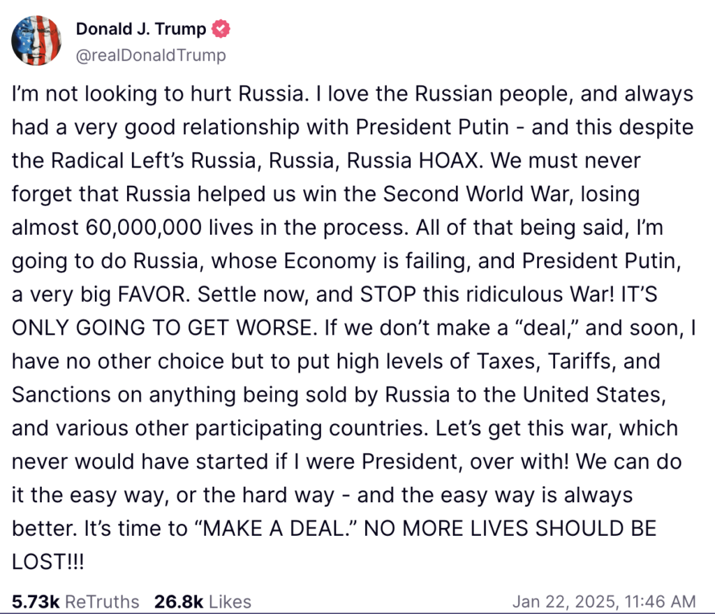 En un mensaje publicado en la plataforma Truth Social, Trump subrayó que su intención no es perjudicar a Rusia. "Amo al pueblo ruso y siempre he mantenido una excelente relación con el presidente [Vladímir] Putin", aseguró. También recordó que Estados Unidos nunca debe olvidar la ayuda que Rusia brindó en la Segunda Guerra Mundial, destacando que el país perdió casi 60 millones de vidas en ese proceso.