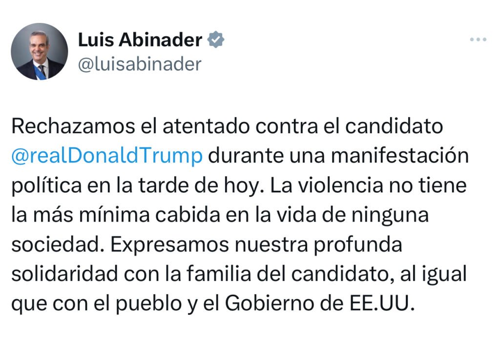 Abinader a través de su cuenta de X, expresó que la violencia no tiene la más mínima cabida en la en la vida de ninguna sociedad; al tiempo que expresó su solidaridad con la familia del candidato, al igual que con el pueblo y el Gobierno de EE.UU.